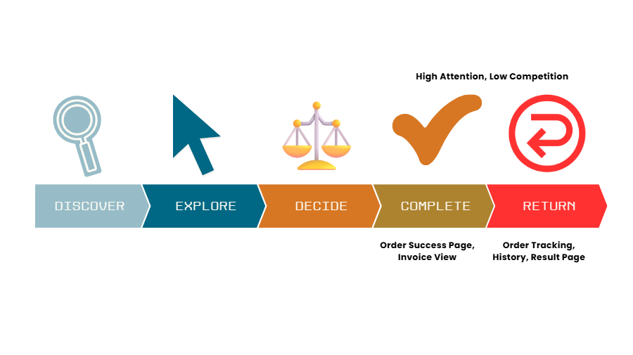 Return – ketika pengguna kembali untuk memeriksa status, progres, atau hasil. Halaman status atau progres biasanya memiliki retention rate tertinggi, namun sering kali dibiarkan menjadi ‘ruang kosong’ secara monetisasi.